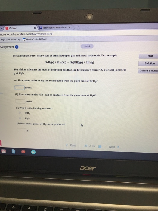 The number of moles of hydrogen gas collected can then be calculated from the ideal gas law: (n = # moles H 2) Convert # moles Mg reacted to moles of H 2 that could be produced. (1 mole H 2 is produced for every 1 mole Mg reacted- this comes from the balanced chemical equation): ... Doc Viewer