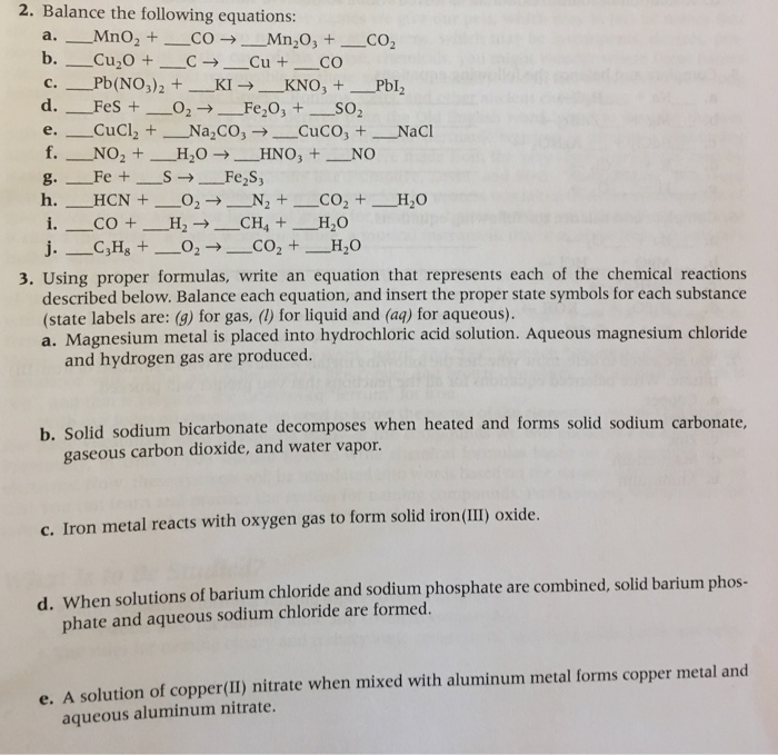Balancing Chemical Equations Worksheet Student Instructions 1. Identify the reactants and products and write a word Hydrochloric acid and magnesium react to produce hydrogen gas and a magnesium salt Barium hydroxide reacts with sulfuric acid to produce a white precipitate and water ... Read More